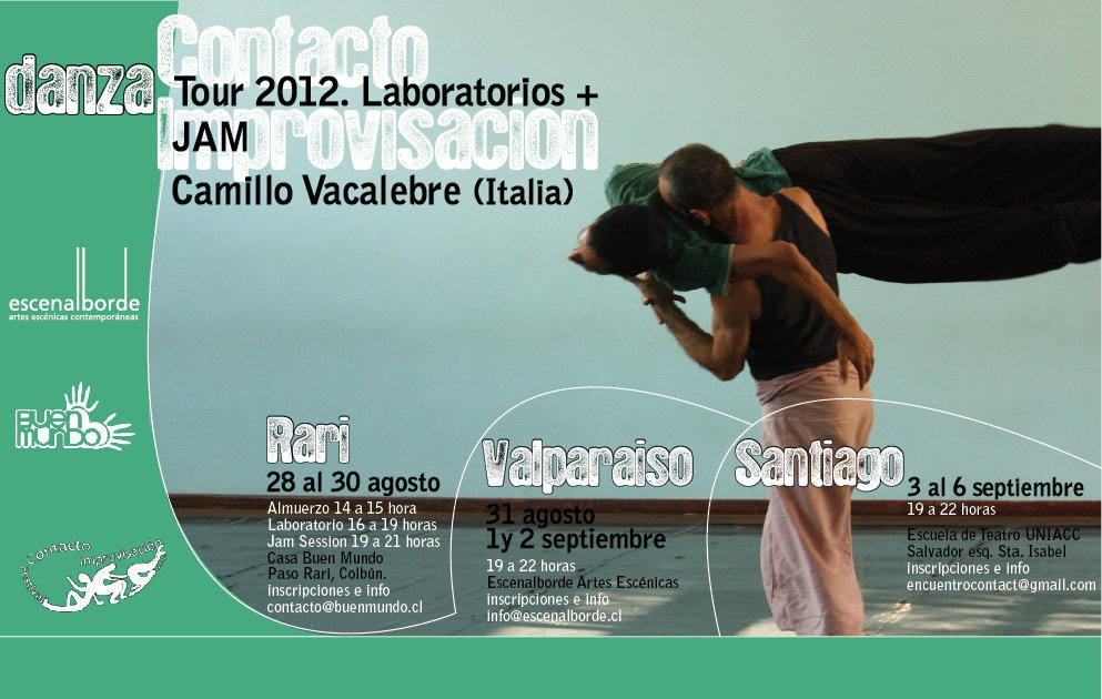 Escenalborde Artes Escenicas de VALPARAÍSO, el Encuentro de Contacto Improvisación de SANTIAGO y Casa Buen Mundo de RARI, nos encontramos organizando de forma conjunta el tour que trae al bailarín Italiano Camillo Vacalebre a dictar Seminarios de Danza de Contacto Improvisación este 2012.