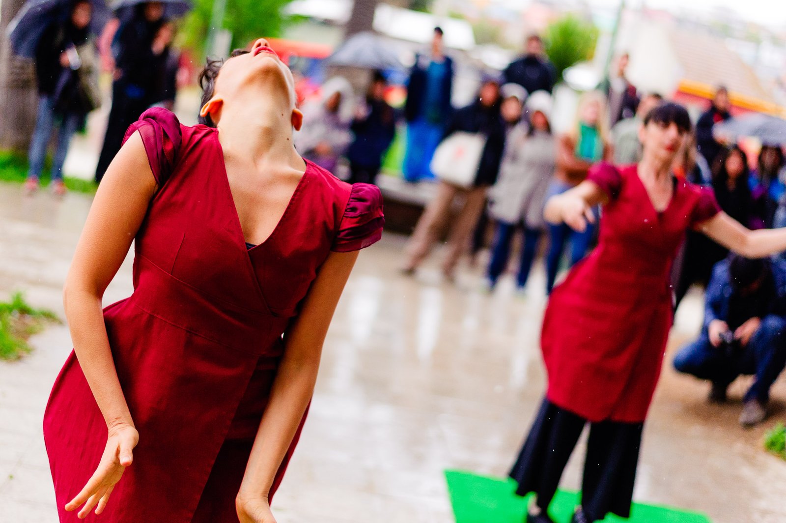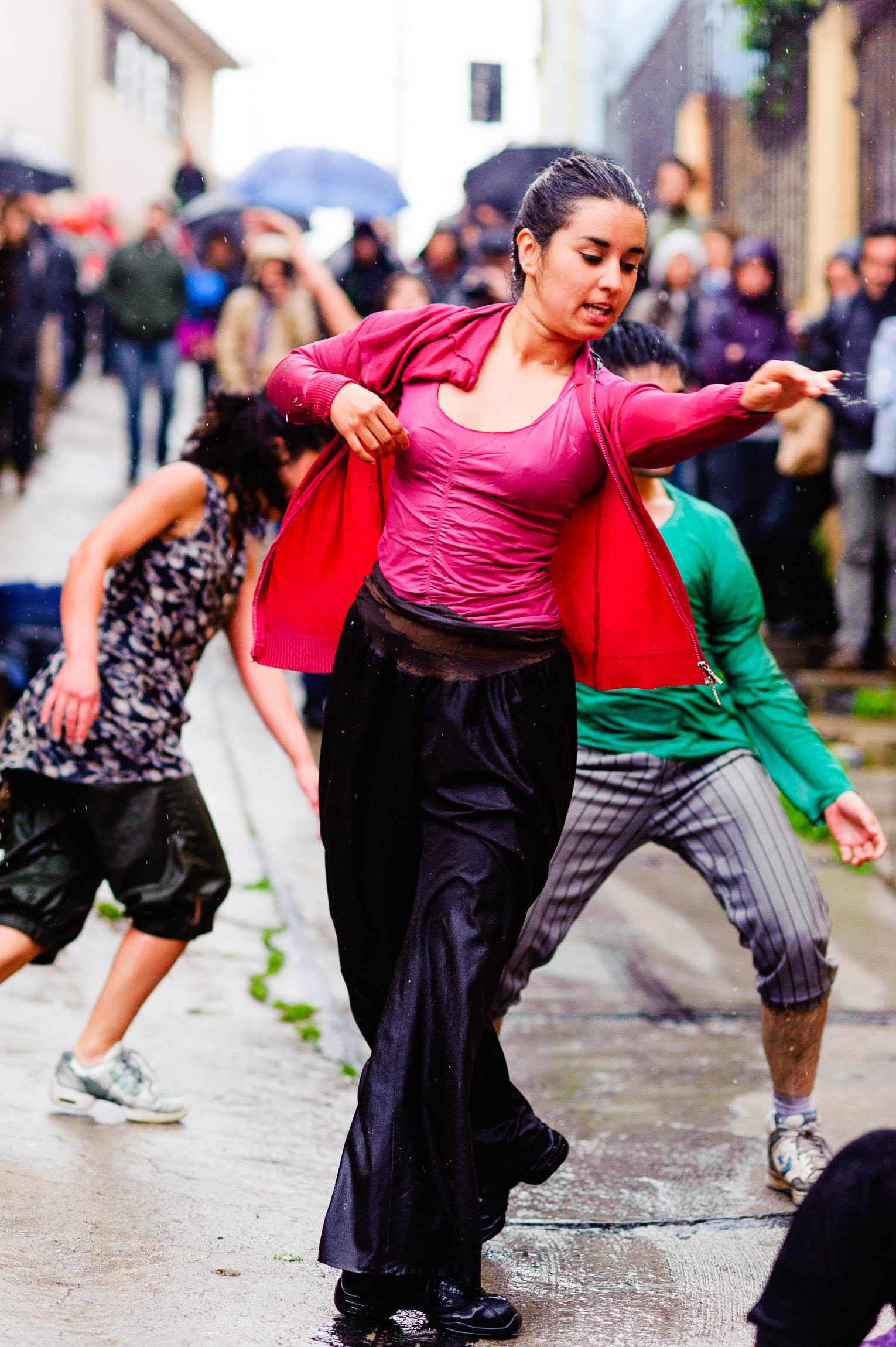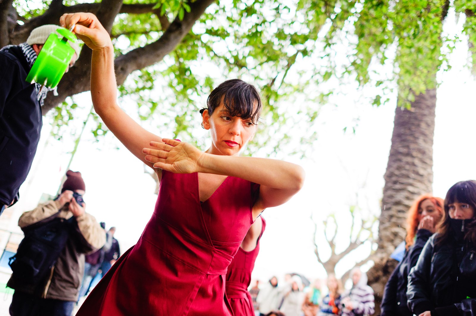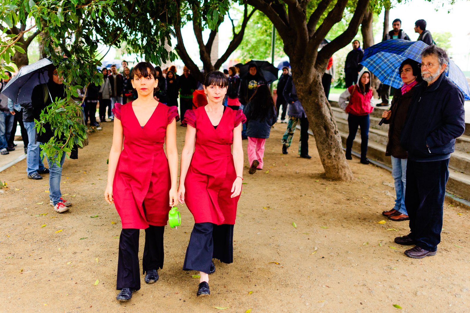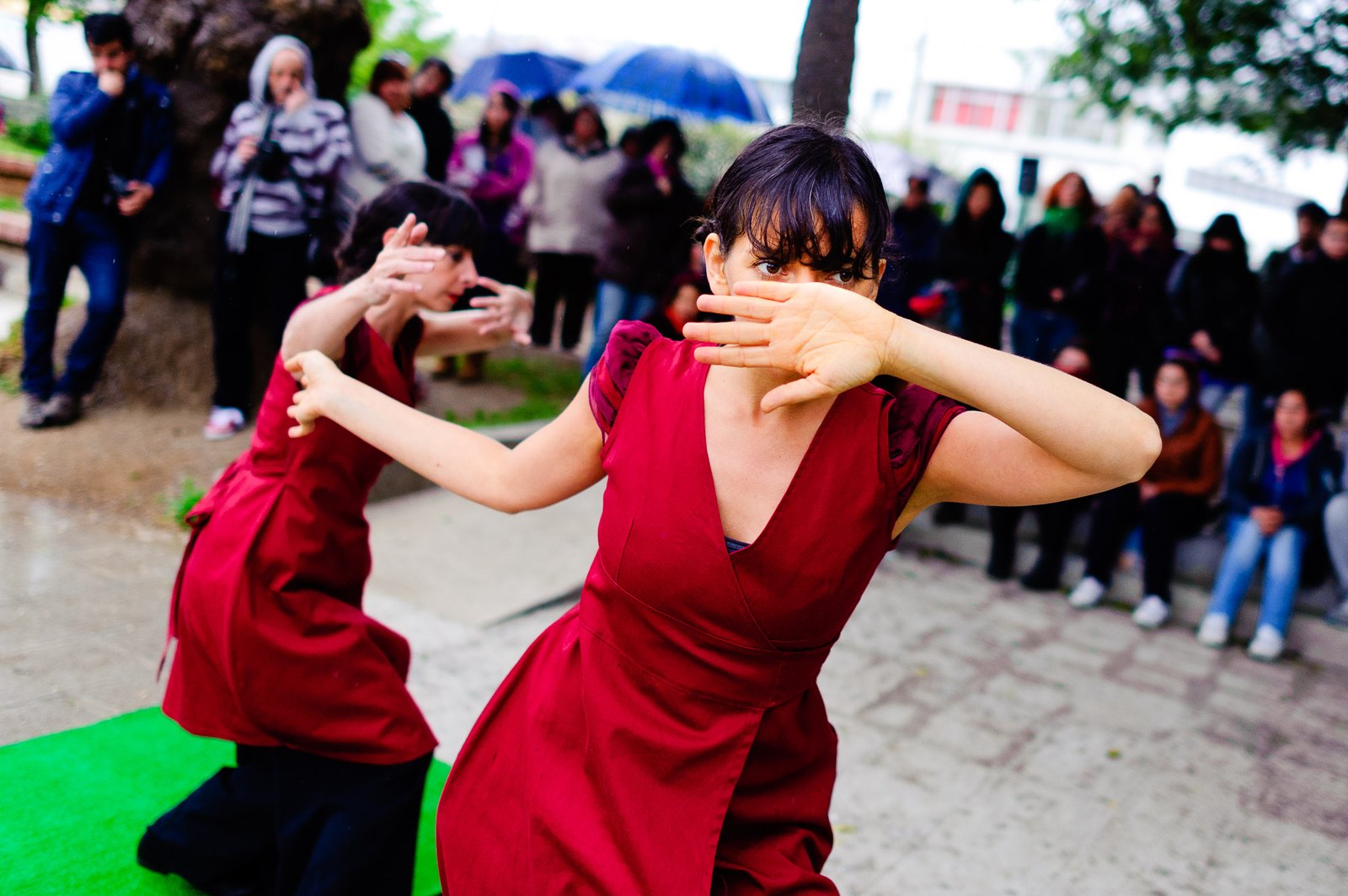 El domingo 21 de octubre el clima nos sorprendió con una constante y fina llovizna. Hasta último momento nos preuntabamos si el público llegaría. Ya sí fue, un grupo grande de personas se fueron acercando y ubicando bajo los árboles de la Plaza Mena, par apresenciar las intervenciones «Decussation # 2» a cargo dela Compañía de Lilian Moussa de Qubéc, Canadá, y «Kokoro» de las argentinas Quío Binetti y Analía Rodríguez. El clima no parecía colaborar, pero eso no fue impedimento para que el grupo de bailarines locales de «Un organismo» experiencia guiada por Iván Sánchez Ramírez, co director del Festival Danzalborde, avanzara por las calles acompañados de una procesión de personas que sostuvieron bajo la lluvia hasta el final el clima de la presentación. Verdaderamente para los que estuvimos alli, un acto colectivo de encuentro en torno a los cuerpos en movimiento.