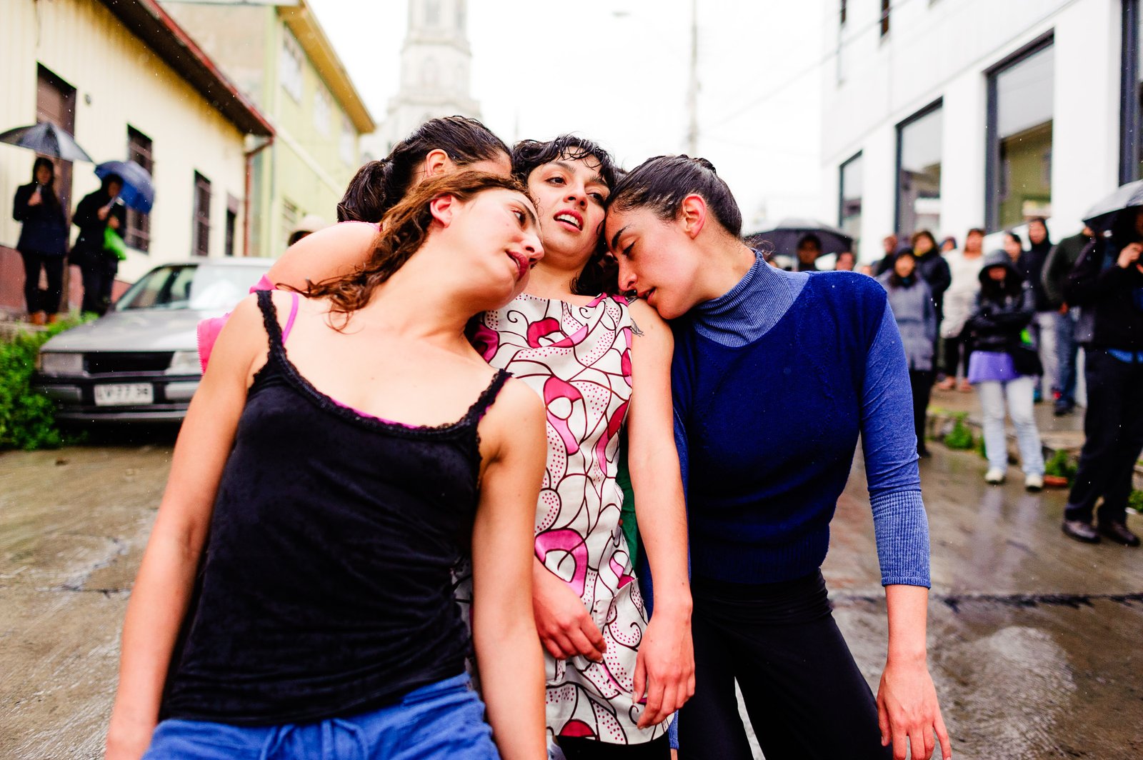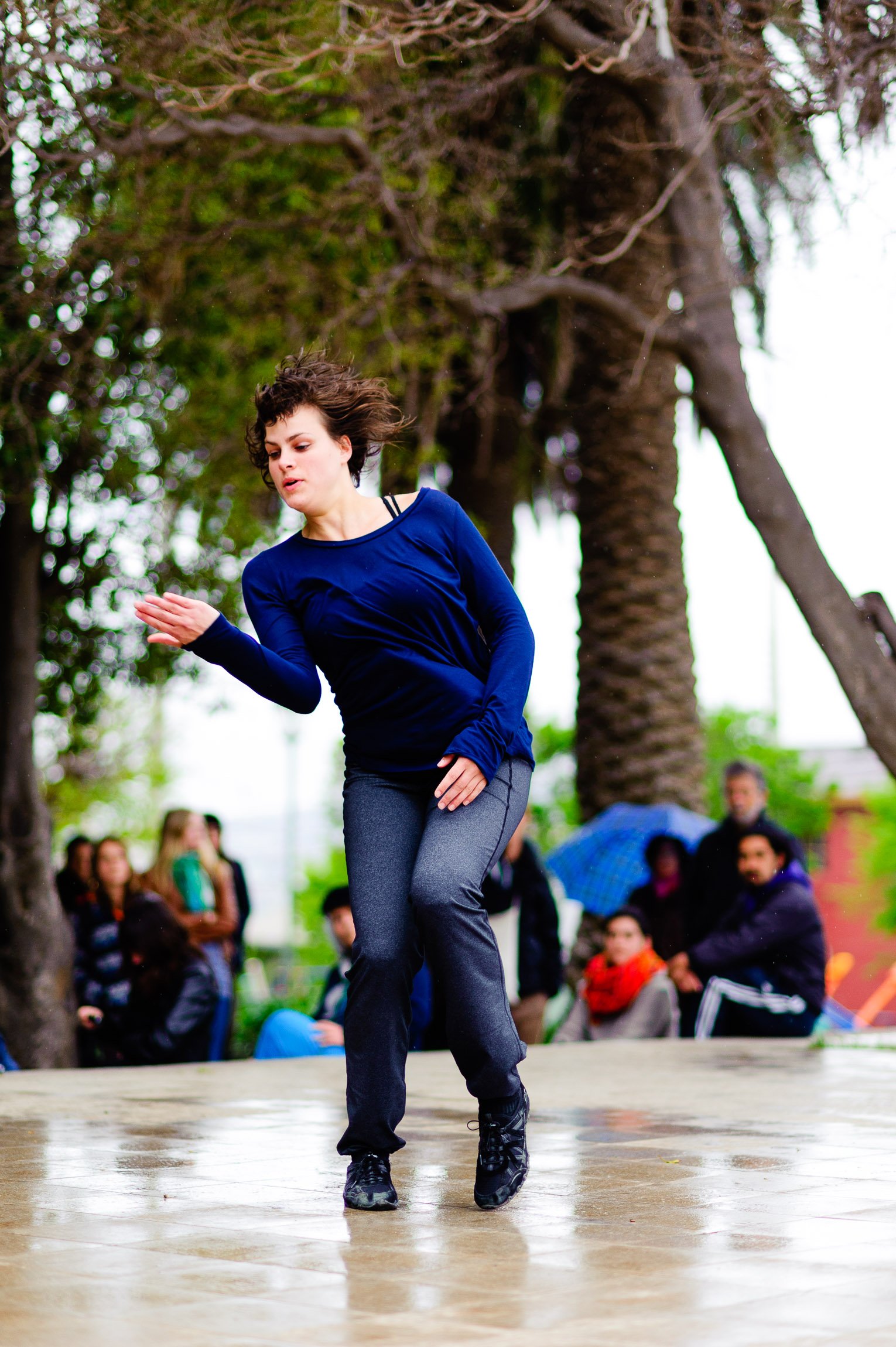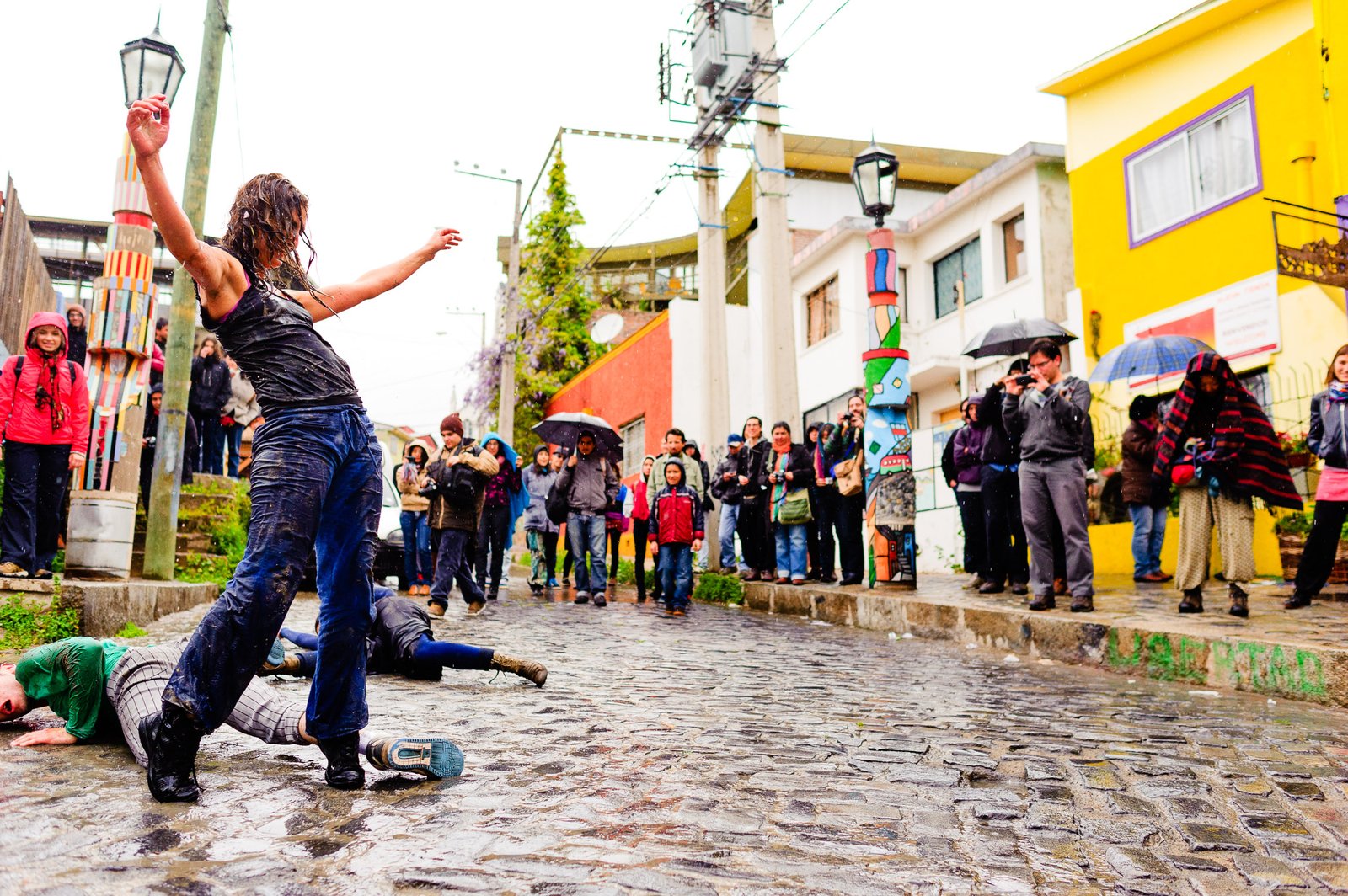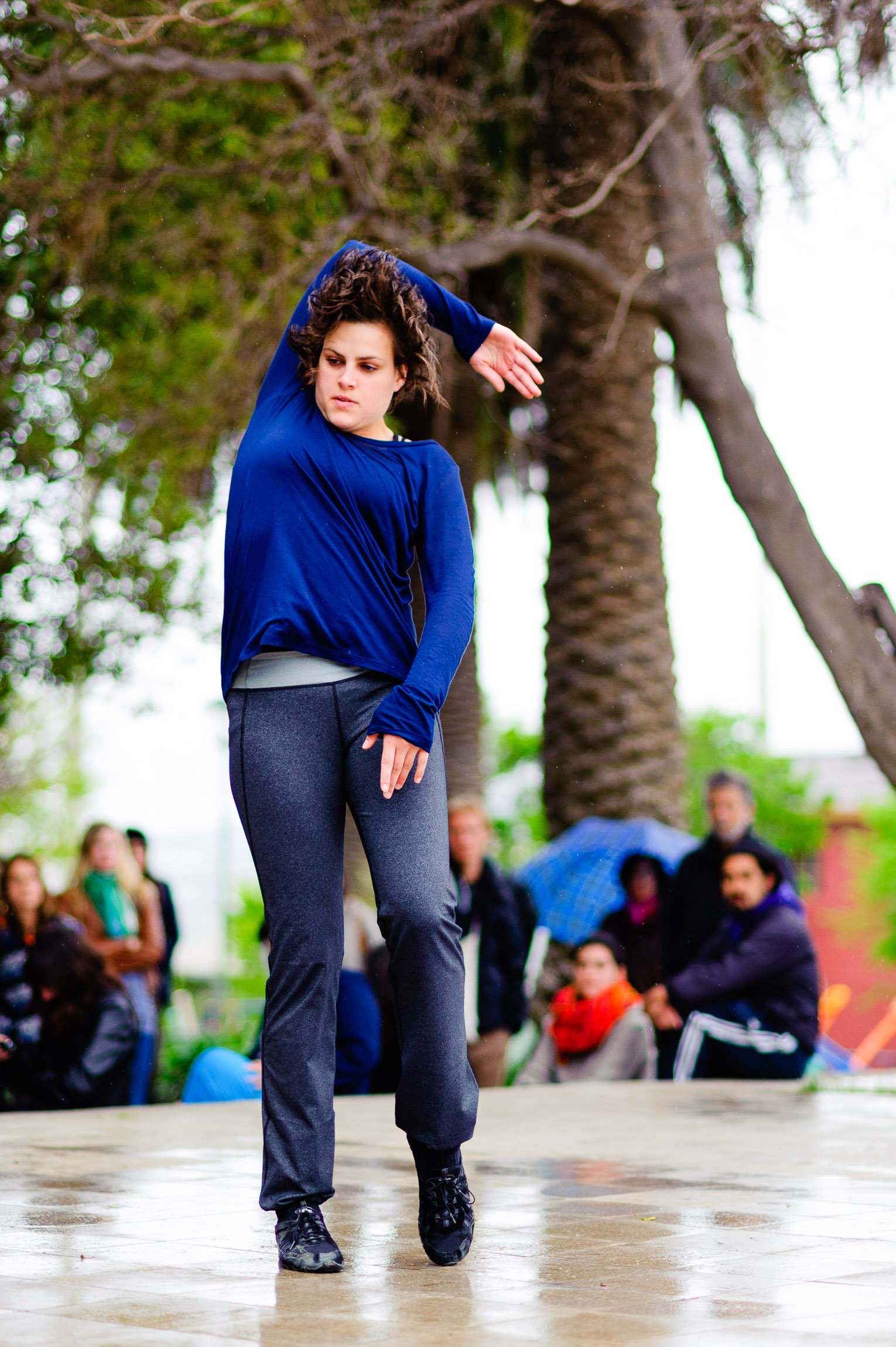 El domingo 21 de octubre el clima nos sorprendió con una constante y fina llovizna. Hasta último momento nos preuntabamos si el público llegaría. Ya sí fue, un grupo grande de personas se fueron acercando y ubicando bajo los árboles de la Plaza Mena, par apresenciar las intervenciones «Decussation # 2» a cargo dela Compañía de Lilian Moussa de Qubéc, Canadá, y «Kokoro» de las argentinas Quío Binetti y Analía Rodríguez. El clima no parecía colaborar, pero eso no fue impedimento para que el grupo de bailarines locales de «Un organismo» experiencia guiada por Iván Sánchez Ramírez, co director del Festival Danzalborde, avanzara por las calles acompañados de una procesión de personas que sostuvieron bajo la lluvia hasta el final el clima de la presentación. Verdaderamente para los que estuvimos alli, un acto colectivo de encuentro en torno a los cuerpos en movimiento.