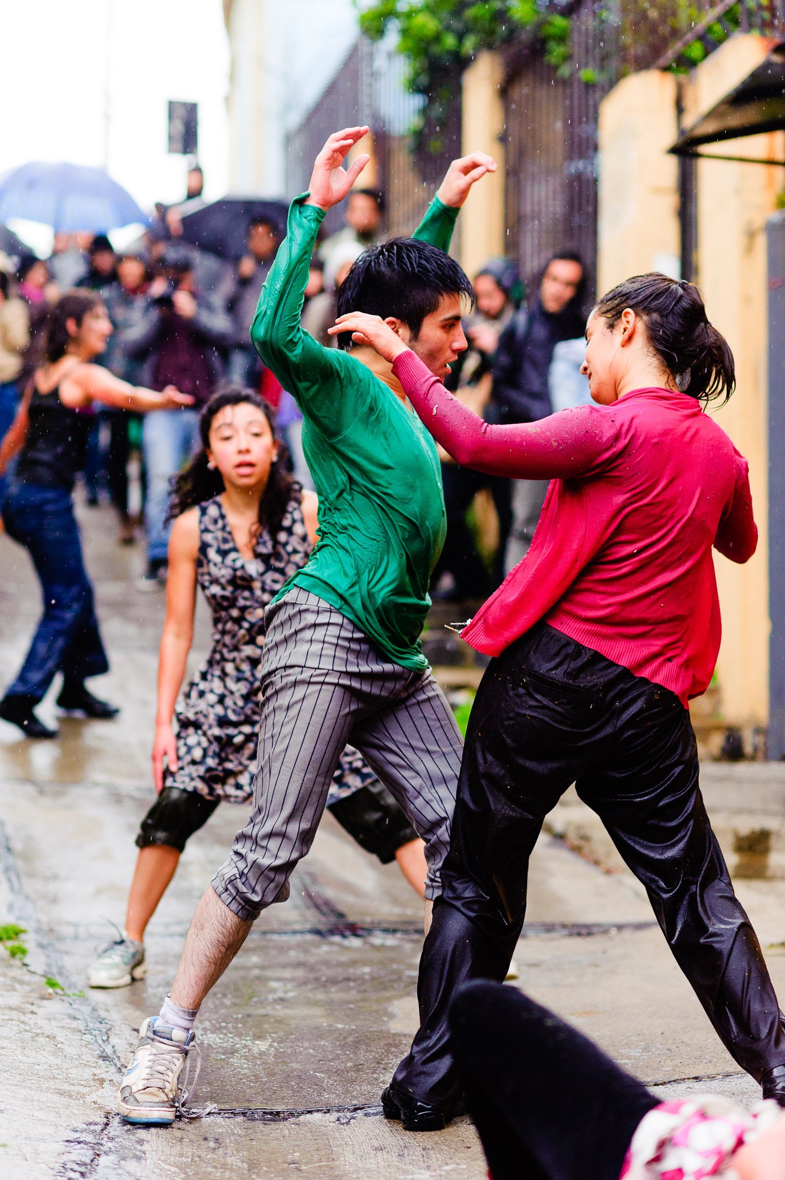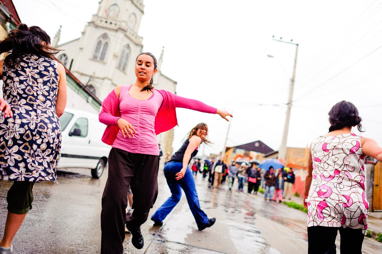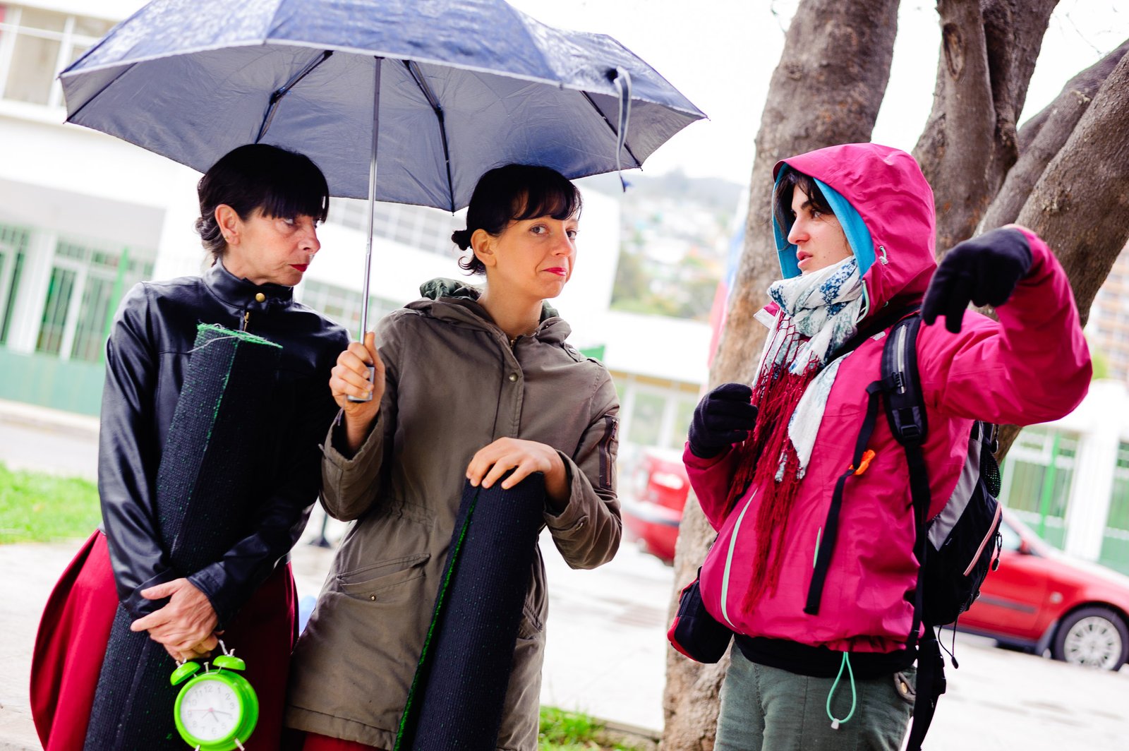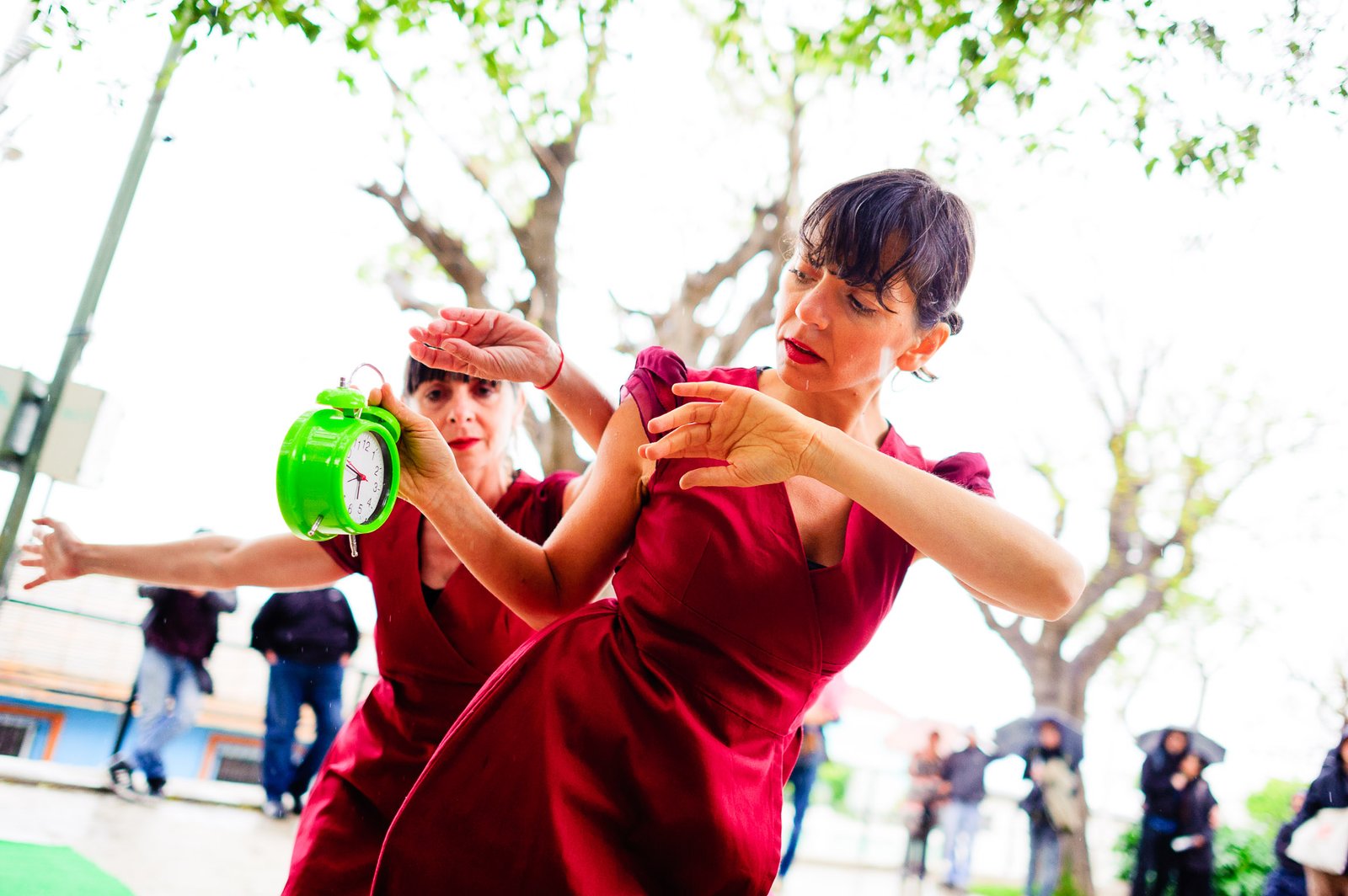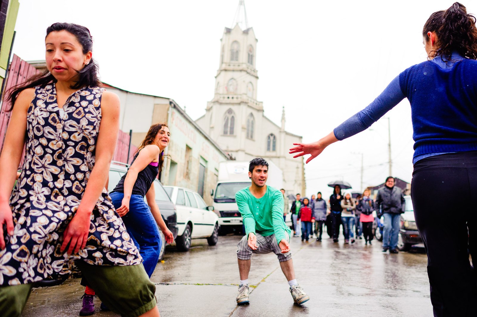 El domingo 21 de octubre el clima nos sorprendió con una constante y fina llovizna. Hasta último momento nos preuntabamos si el público llegaría. Ya sí fue, un grupo grande de personas se fueron acercando y ubicando bajo los árboles de la Plaza Mena, par apresenciar las intervenciones «Decussation # 2» a cargo dela Compañía de Lilian Moussa de Qubéc, Canadá, y «Kokoro» de las argentinas Quío Binetti y Analía Rodríguez. El clima no parecía colaborar, pero eso no fue impedimento para que el grupo de bailarines locales de «Un organismo» experiencia guiada por Iván Sánchez Ramírez, co director del Festival Danzalborde, avanzara por las calles acompañados de una procesión de personas que sostuvieron bajo la lluvia hasta el final el clima de la presentación. Verdaderamente para los que estuvimos alli, un acto colectivo de encuentro en torno a los cuerpos en movimiento.