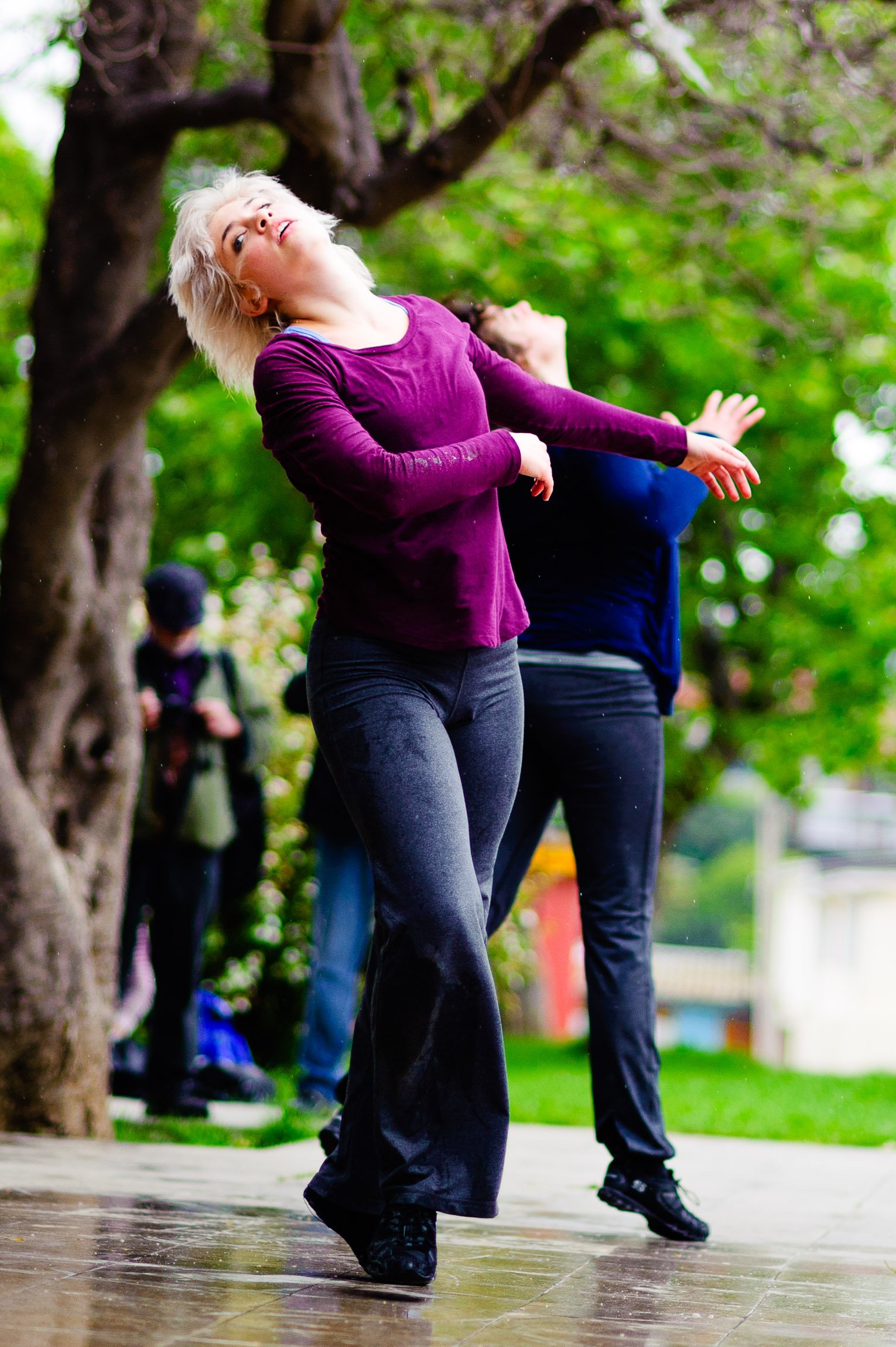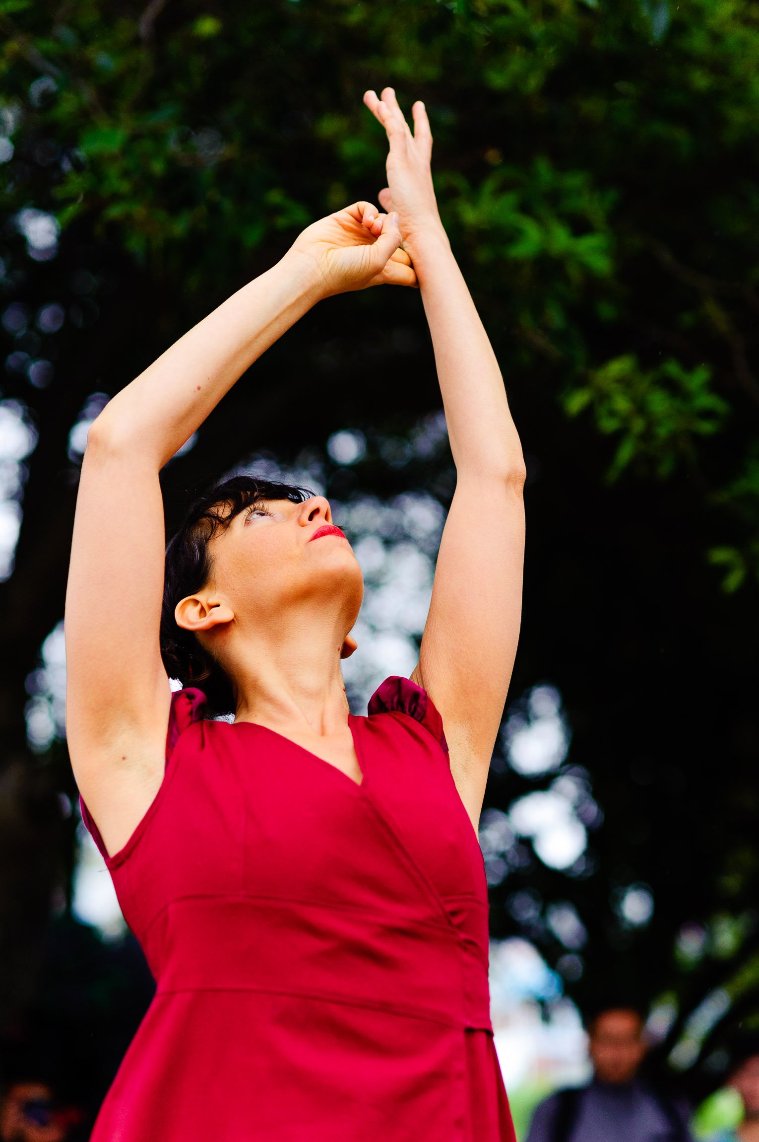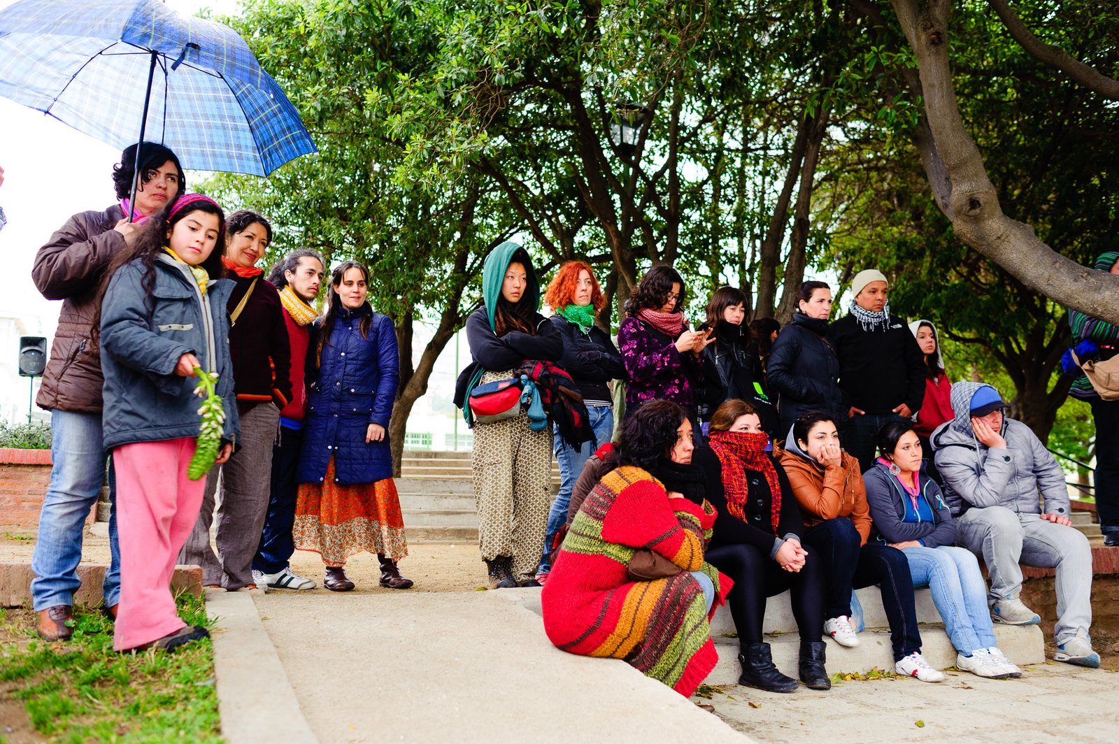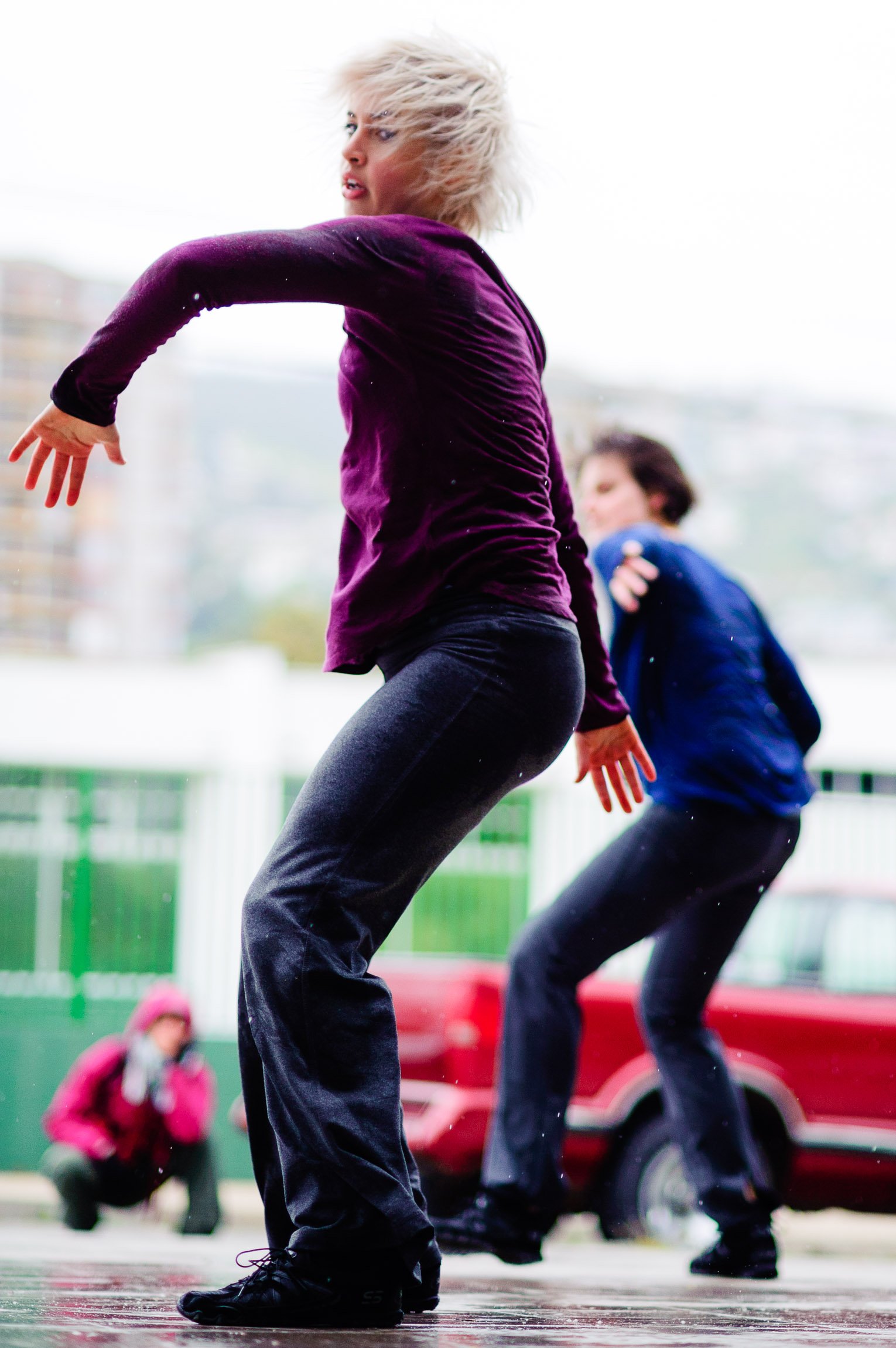 El domingo 21 de octubre el clima nos sorprendió con una constante y fina llovizna. Hasta último momento nos preuntabamos si el público llegaría. Ya sí fue, un grupo grande de personas se fueron acercando y ubicando bajo los árboles de la Plaza Mena, par apresenciar las intervenciones «Decussation # 2» a cargo dela Compañía de Lilian Moussa de Qubéc, Canadá, y «Kokoro» de las argentinas Quío Binetti y Analía Rodríguez. El clima no parecía colaborar, pero eso no fue impedimento para que el grupo de bailarines locales de «Un organismo» experiencia guiada por Iván Sánchez Ramírez, co director del Festival Danzalborde, avanzara por las calles acompañados de una procesión de personas que sostuvieron bajo la lluvia hasta el final el clima de la presentación. Verdaderamente para los que estuvimos alli, un acto colectivo de encuentro en torno a los cuerpos en movimiento.