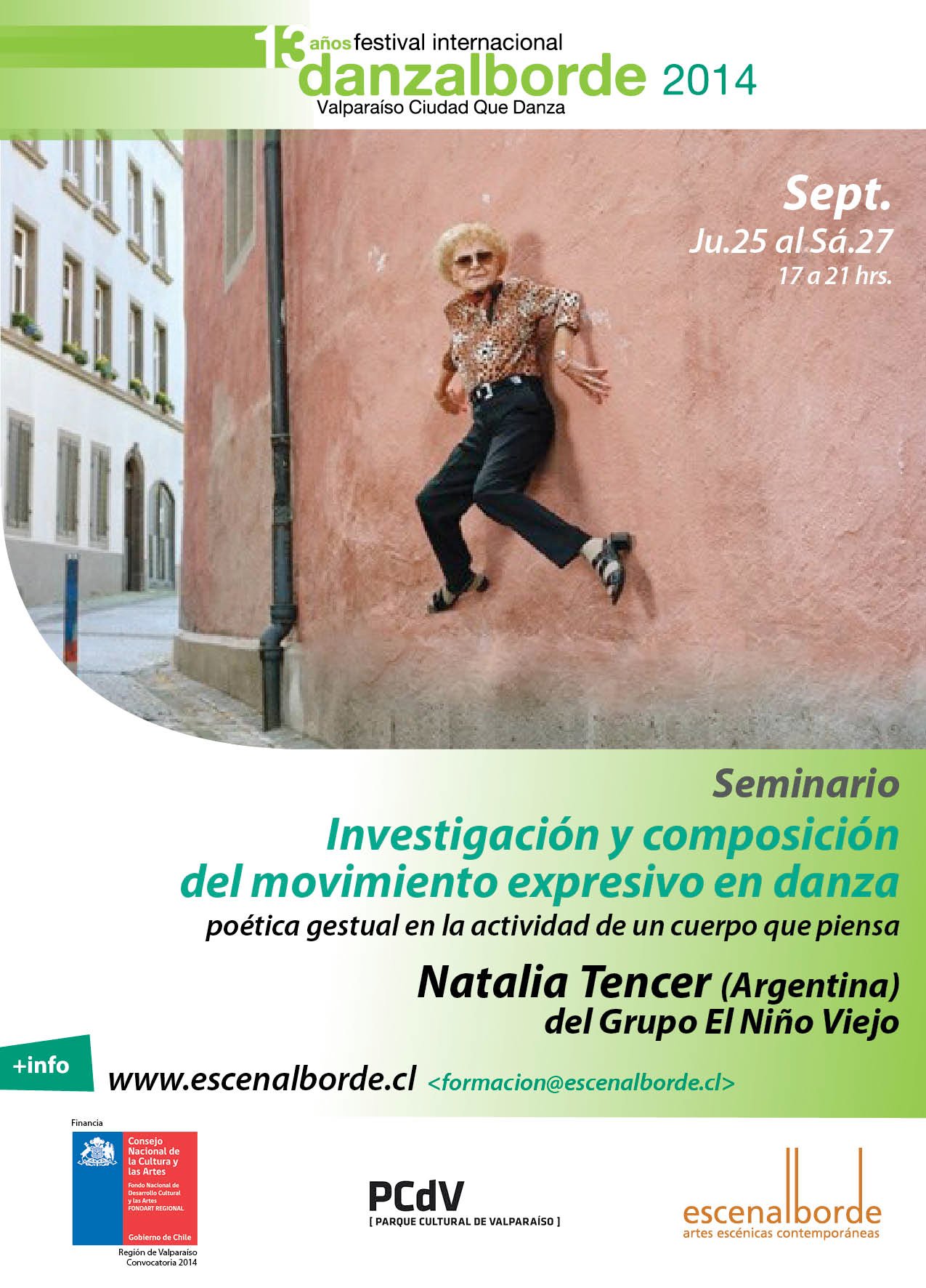 poética gestual en la actividad de un cuerpo que piensa”, de Natalia Tencer se sustenta en los siguientes fundamentos: “nos preguntaremos acerca de la narración, el relato y el sentido del acontecimiento físico expresivo del movimiento del cuerpo. Cuán aislado o vinculado está con lo que lo rodea. Qué relaciones temporales y espaciales compone. De dónde viene y qué organiza su existencia actual. Hacia dónde va todo gesto, acción y movilidad. Qué lo hace ser existencia. Haremos dialogar y sospechar entre sí lo inédito y novedoso del movimiento, con aquello que suponemos excluir. Dónde y cómo observamos y recreamos la plasticidad poética de la composición físico expresiva de los cuerpos. Cómo nos ponemos en relación con el entorno espacio temporal. La idea de permanencia y duración, de fracaso y aburrimiento. Mover y permitir pronunciar un estado de exposición. Hacer y dejarse hacer. Mirar y dejarse ver. Darse a ver – hacer para dejarse mirar. Dejarse ejercer y ser actuado por la repercusión de lo que en el cuerpo y los otros cuerpos se organiza y exterioriza. La infinita y constante oscilación de obrar y reconstruir, para volver a reunir lo que construí, y todo nos sirve, hasta incluso aquello a lo que estamos acostumbrados…
