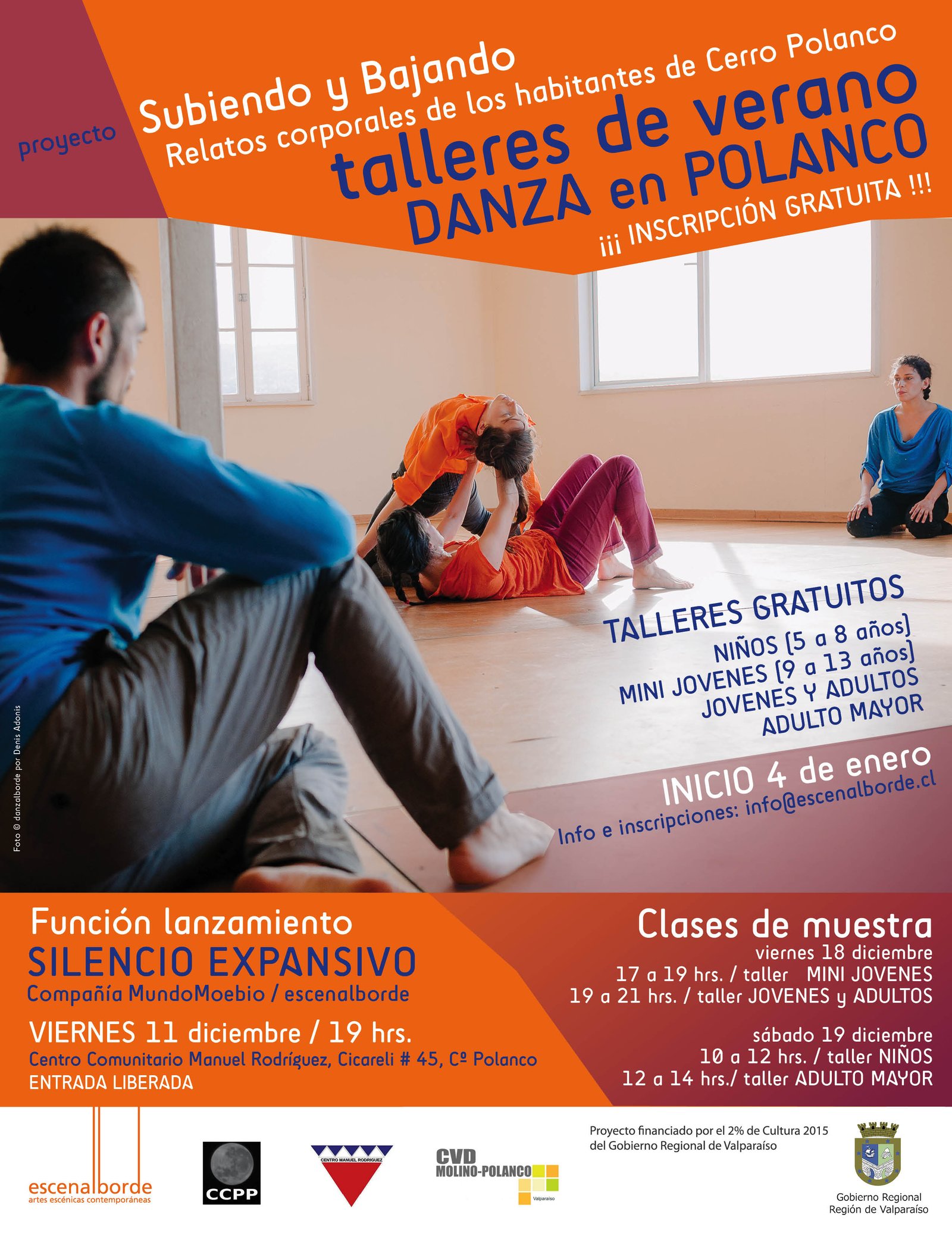 SUBIENDO Y BAJANDO, RELATOS CORPORALES DE LOS HABITANTES DE CERRO POLANCO, proyecto financiado por el 2% del Fondo de Cultura del Gobierno Regional de Valparaíso, a través del que se impartirán durante el mes de ENERO 2016, que con el apoyo del Centro Cultural Planeta Polanco implementará TALLERES DE DANZA DE VERANO para todas las edades en el Centro Comunitario Manuel Rodríguez.