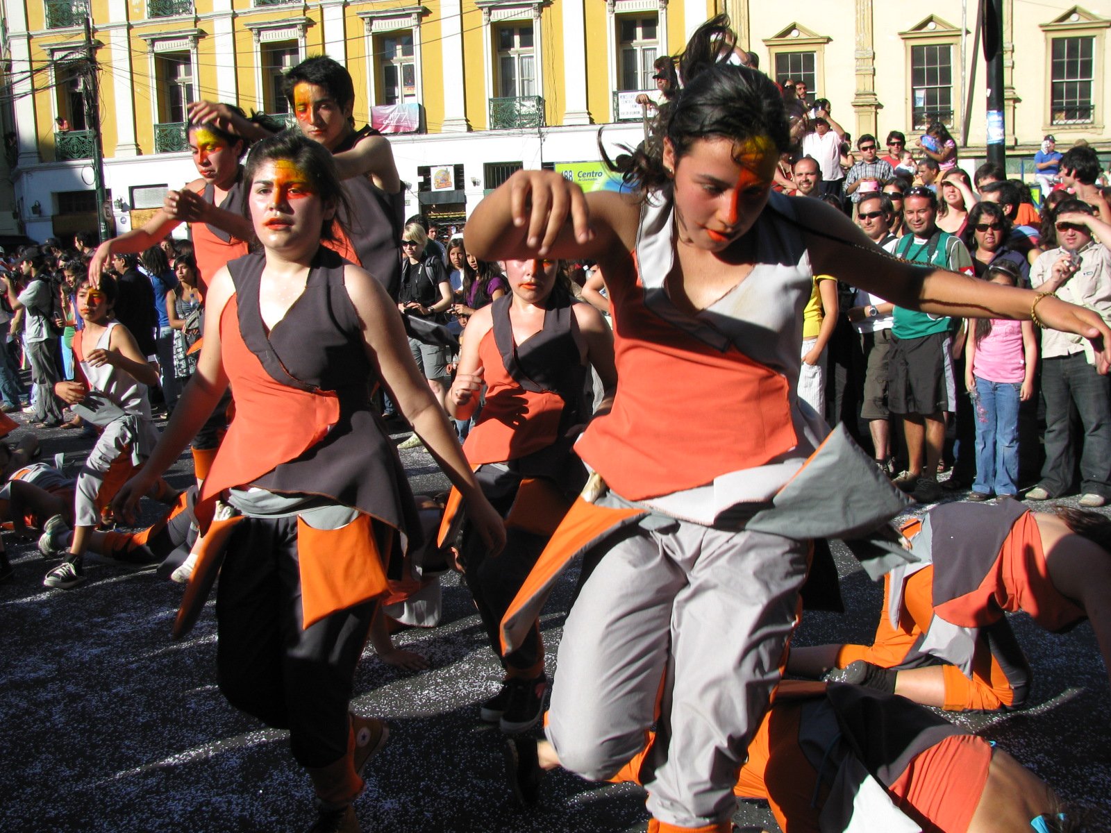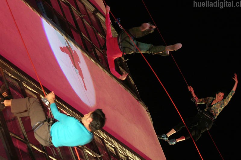 Coreografía de danza aérea nocturna realizada el año 2006 por escenalborde en el frontis del Consejo Nacional de la Cultura y las Artes en Valparaíso con motivo de la inauguración del Festival Internacional danzalborde. Foto de huelladigital.cl